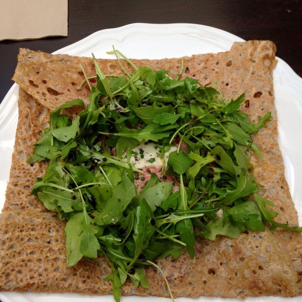 both a savoury galette and a sweet crepe. From the galettes I went for the salami and chilli, which consisted of sliced salami, melted raclette, chilli relish, rocket, oil and balsamic, £6.The galette is slightly thicker than a crepe and is made from buckwheat flour. Crispy around the edges yet still soft on the inside. The rocket which was finely presented on top of the galette not only added colour but was both fresh and crunchy and the strong taste of the rocket worked well with the drizzle of balsamic. The cheese works well at combining the dish and again forms a good partnership in complementing the thinly sliced salami. It was layered very well as at the bottom of the galette you get the chilli relish that offers a kick to go with the creamy texture of the raclette cheese. Overall the galette was well presented and had sprinkles of finely cut chives to add more flavour and was finished with an even amount of each of the toppings.