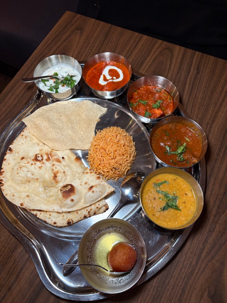 The combination of curries such as lamb Desi, Lagan Chicken, Butter Chicken and Tadka daal offers a range of flavours, from the robust and spicy to the creamy and comforting. Accompanied by, yoghurt, popadoms, rice and naan, this dish is a well-rounded feast. The Gulab jamun sweet treat at the end adds a delightful touch, making the thali an excellent choice for both newcomers to Indian cuisine and seasoned enthusiasts.