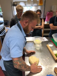 pairs. Once we had done this, we covered with cling film and left it in the fridge to cool. Next, Tom demonstrated how to create a rough puff pastry but as we went through the process, he asked different people to do the various parts of the pastry making process. This was really useful as it kept the course hands on whilst also helping people to develop their skills. As the pastry was being completed it was really interesting to hear the science and importance of creating the layers of fat ‘butter’ in the pastry to allow the creation of layers for an effective puff pastry. Following this, Tom showed us how to create a chicken and mushroom filling for the pies we were