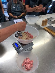 After our boiled water pastry had cooled, we set about making our pork filling. Skilled butcher Chris Moorby was fascinating to watch as he shared his