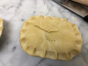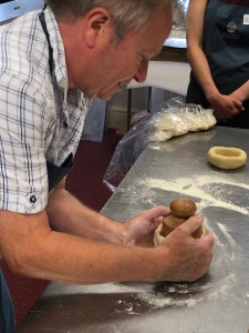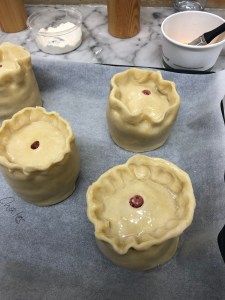 press down carefully so that we could see daylight through the base before pressing it up the sides until it reached the top. (He also pointed out that if you didn’t have a ‘dolly’ at home, jam jars also work well). After we had followed his demonstration, he showed us how to put the pastry on the top using a variety of crimping skills to create a different finish with one being similar to that used in a traditional Melton Mowbray pork pie. After this we egg washed the pie before placing in an oven to cook through and until the pork reached around 80 degrees Celsius.