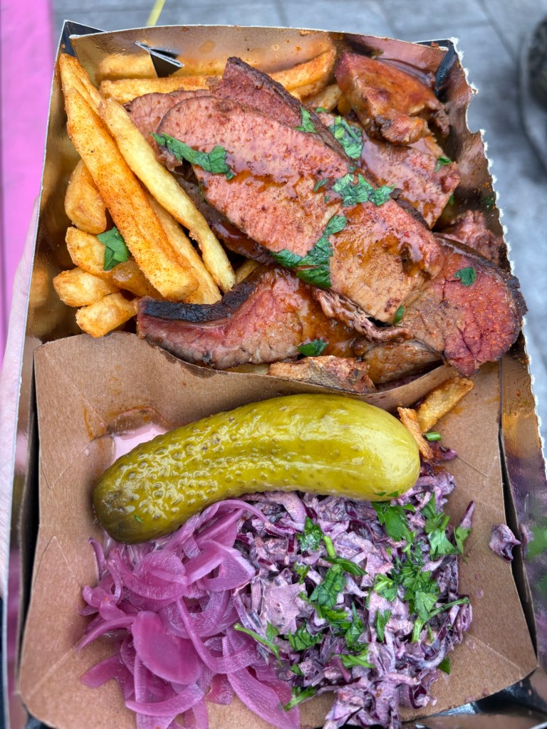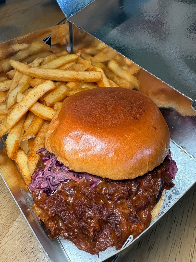 The star of the show for me was the beef brisket, It arrived with a tantalizingly dark bark that hinted at hours of slow smoking, resulting in a rich depth of flavour and tender, juicy meat that just fell apart. Each bite was the perfect balance of tenderness, with just enough fat to make it juicy without being overwhelming. The seasoning was simple but effective, adding enough flavour to bring out the meat’s natural flavours. Alongside this, the creamy coleslaw added a refreshing contrast to the hearty brisket and fries. It had just the right amount of tang and sweetness, with a crisp texture that added a necessary creaminess to contrast the rich meat. The fries were good quality too, golden, crisp and well seasoned.