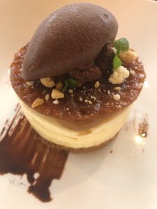 brandy snap and chocolate. A well-constructed dessert with an interesting range of textures and a balance of flavours. The biscuit base was light and crumbly and the cheesecake was creamy and thick. This was contrasted by a salty and sweet peanut butter and a crisp bandy snap on the top.