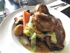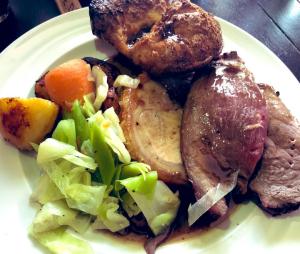 meats they serve cow, pig and sheep. The portions were monumental. All the meat was juicy and not dry at all. The beef and lamb were served slightly pink which added to the taste and juiciness of the meat. It was slightly tough in places but given the thickness of the slices this was acceptable and pleasing to fill my glutinous appetite. Alongside this was a whole roasted carrot which was buttery and sweet and served slightly al dente and a cabbage and leek