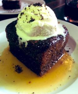Rich chocolatey aroma rose from the plate. The brownie was chewy with a crisp top, the vanilla in the ice cream cut through the richness of the